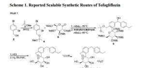 A newly process for the synthesis of tofogliflozin hydrate, a sodium-glucose cotransporter type 2 (SGLT2) inhibitor, was described. Three improvements were achieved, including the development of a regioselective Friedel–Crafts reaction, a high-yield reduction, and a mild metal–halogen exchange. These improvements ultimately resulted in the isolation of tofogliflozin hydrate as a white solid in >99% purity (HPLC area) and 23% overall yield after 12 steps without column chromatography.