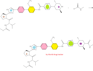 Carbamic acid, N-[(1S)-1-[[(2S)-2-[5-[4′-[[[6-[(2R,5S)-2,5-dimethyl-4-[(methylamino)carbonyl]-1-piperazinyl]-3-pyridinyl]carbonyl]amino]-2′-(trifluoromethoxy)[1,1′-biphenyl]-4-yl]-1H-imidazol-2-yl]-1-pyrrolidinyl]carbonyl]-2-methylpropyl]-, methyl ester