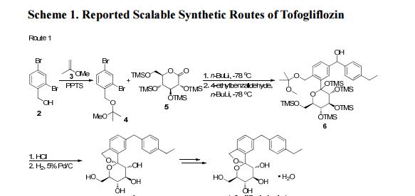 There are two scalable synthetic routes reported to prepare tofogliflozin.2 An efficient production synthesis of tofogliflozin hydrate from alcohol 2 was first described by Murakata et al. (Scheme 1, route 1).2a In 2016, Ohtake et al. reported an improved synthetic route, which achieved in just 7 linear steps (Scheme 1, route 2).2b They selected the optimal protecting groups for the purpose of chemoselective activation and crystalline purification, and obtained the pure tofogliflozin in a good overall yield. However, these methods suffer from several drawbacks. Firstly, some reagents, such as BH3 (Scheme 1, route 2) and 2-Methoxyproene (3, Scheme 1), are toxic or highly volatile. Meanwhile, the use of Palladium reagents may lead to an excess of residual heavy metal in the final product. Secondly, manufacturing costs in these methods are high due to the application of expensive raw materials and reagents. Last but not least, the key tactical stages that involve Br/Li exchange of aryl bromide followed by addition to gluconolactone 5 need the cryogenic conditions (< -60 oC), and this method is not suitable for industrial production. Herein, we report a newly developed synthetic method for tofogliflozin hydrate starting from readily available raw materials and affording good overall yield.