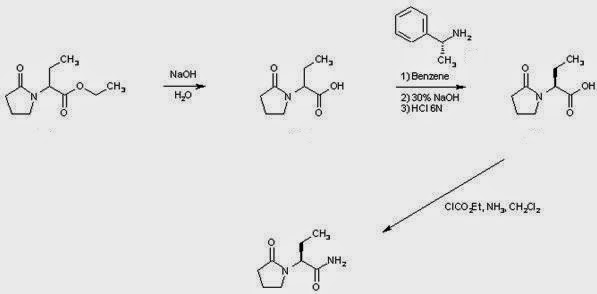 note………….racemic (±)-alpha-ethyl-2-oxo-1-pyrrolidineacetic acid is obt by rxn of 2 pyrolidinone with ethyl 2 bromo acetate